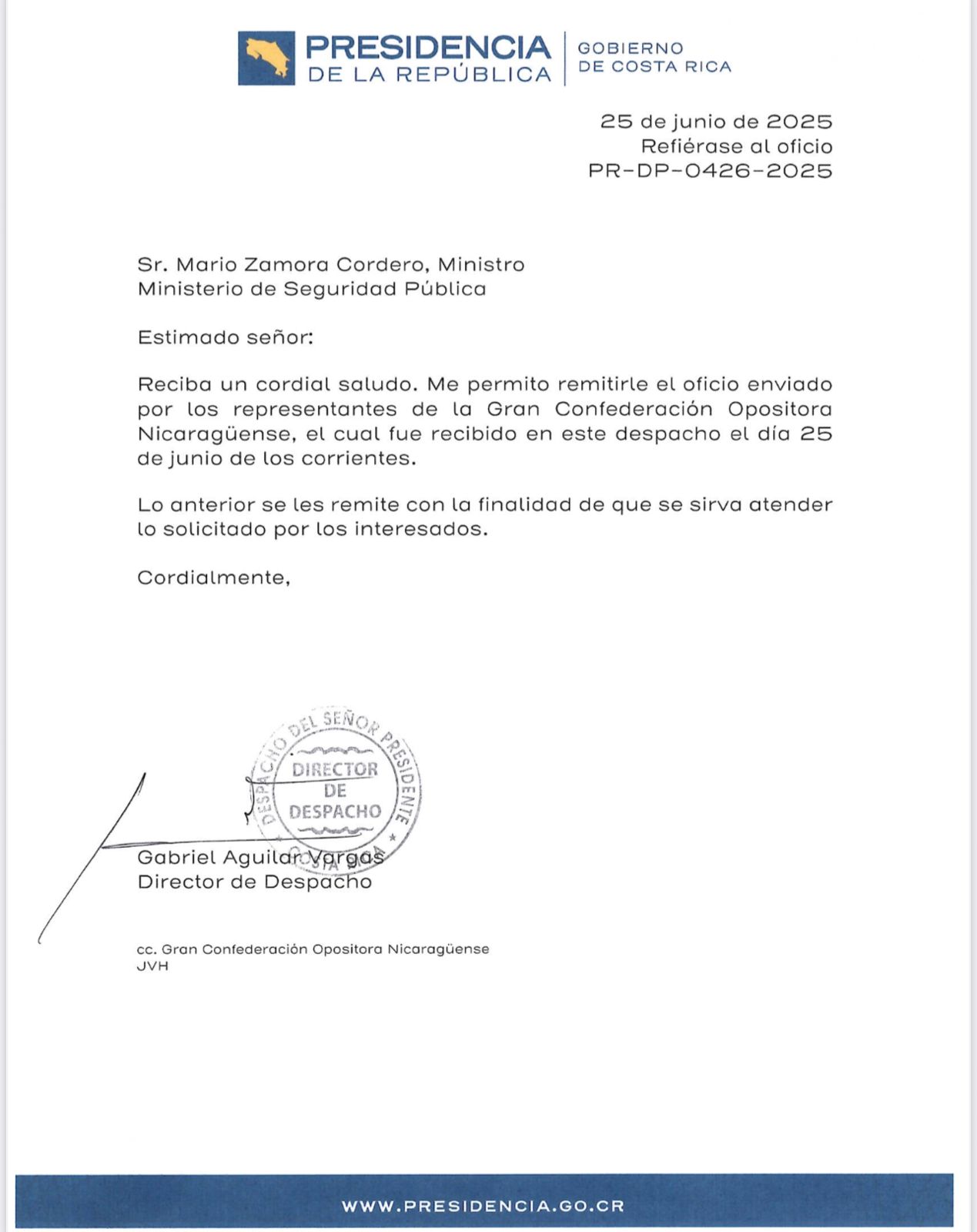 San José, Costa Rica – 2 de julio de 2025 — La Gran Confederación Opositora Nicaragüense (GCON) informa a la opinión pública que ha recibido una respuesta oficial por parte del Gobierno de la República de Costa Rica, a través de la Casa Presidencial, tras la entrega de cartas dirigidas al presidente Rodrigo Chaves, al ministro de Seguridad Pública y al ministro de Relaciones Exteriores.