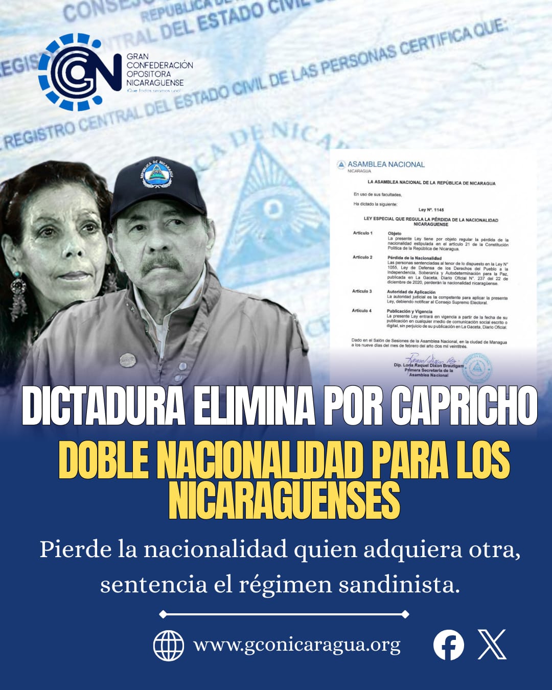 La eliminación de la doble nacionalidad por parte debla dictadura sandinista de Daniel Ortega y Rosario Murillo en Nicaragua tiene implicancias profundas tanto a nivel legal como político y social. Estas son algunas de las principales consecuencias: